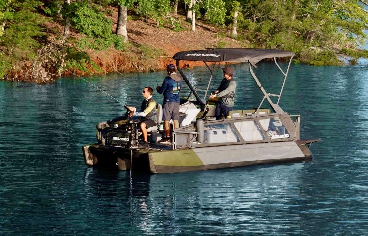 Key features: 13’ fishing pontoon boat with 170 HP Rotax jet drive; five-person capacity; optional rod storage, livewell, cooler and rod holders.