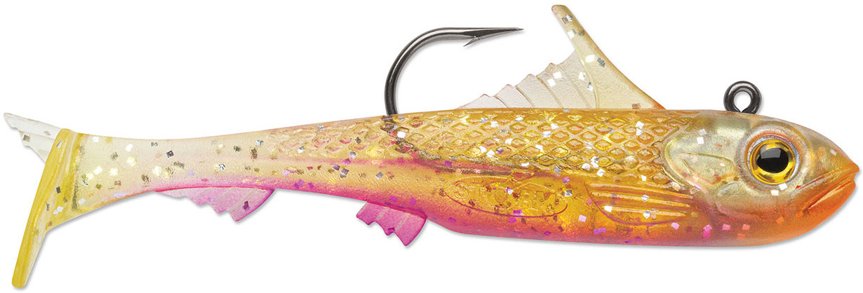 Storm’s latest pre-rigged swimbait combines a lifelike baitfish profile with a subtle swimming action. What truly sets it apart is the prominent dorsal fin that acts as a weedguard—eliminating the need to bury the hook point, as is the case when rigging standard swimbaits as weedless. Weighing ⅛ ounce, it’s available in three- and four-inch versions and a choice of eight colours.