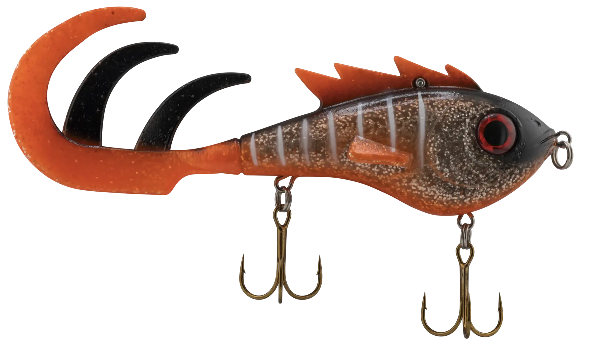 Weighing 4½ ounces, the eight-inch Menace from Livingston Lures has the size to match its intimidating appearance. While it’s designed for pull-pause jerkbait presentations, it can also be bounced off structure. And on the pause, the lure’s rounded belly produces a rocking wobble that screams injured baitfish. It comes in six amusingly named colours, including nuclear perch, bottle rocket (shown) and vanilla ice.