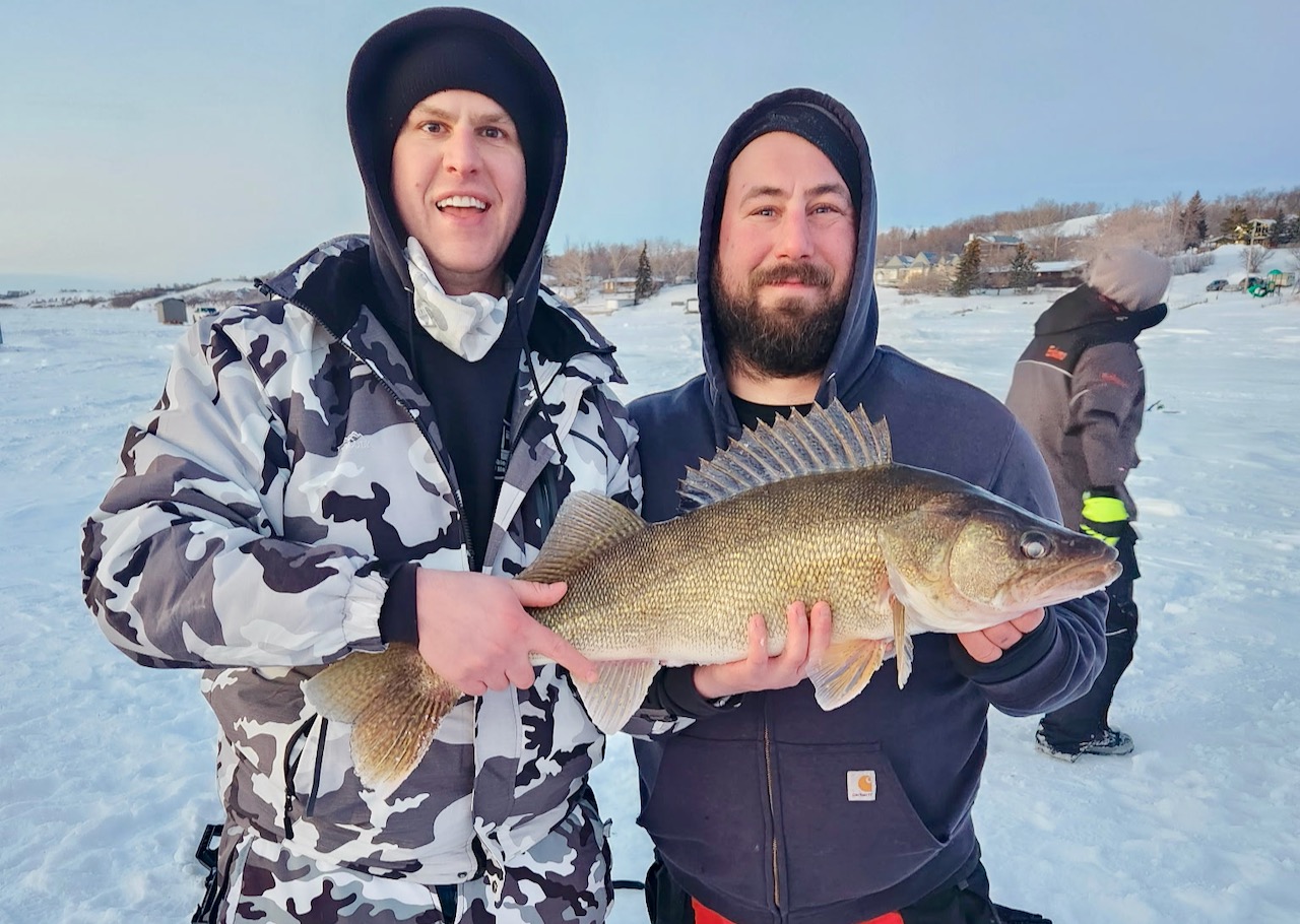 The sun was setting at Saskatchewan’s Last Mountain Lake last February when Cody Hanson (right) hooked, but lost, a nice fish. Wasting no time, Jeff Wagner (left) spotted the escapee on his LiveScope and promptly caught it. According to Jeff, the 31-inch walleye was safely released after a five-minute fight.