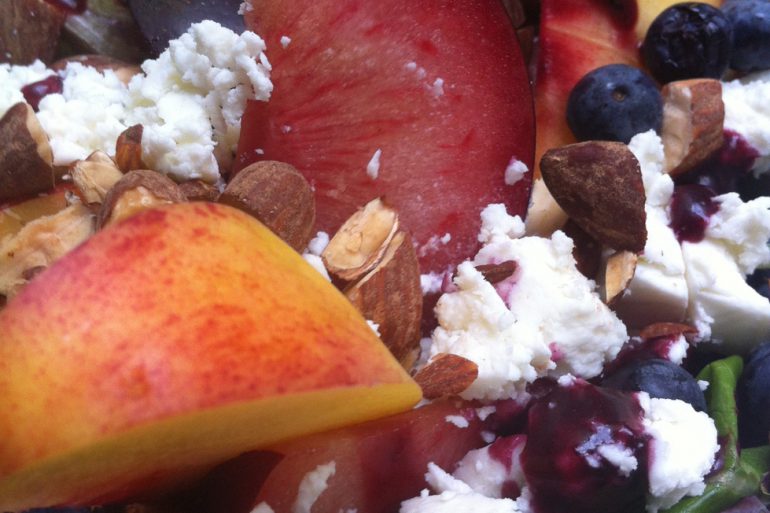 Planked salmon and Okanagan stone-fruits salad