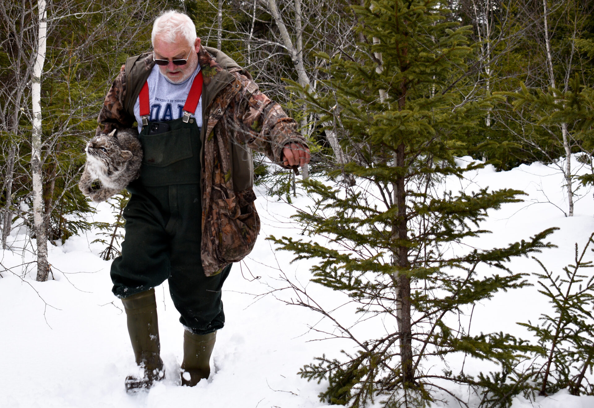 As White is freeing a dead bobcat from a snare, on one of the animal’s claws catches his thumb. “Ahh @#$%&!” he shouts, his curse breaking the silence of the winter woods. He grabs the spotted grey corpse—it’s the size of a beagle—and slowly walks through the thick snow on the uneven forest floor. Blood streaks down his hand. “I’ll have to soak that,” he says, knowing cat claws are full of bacteria.