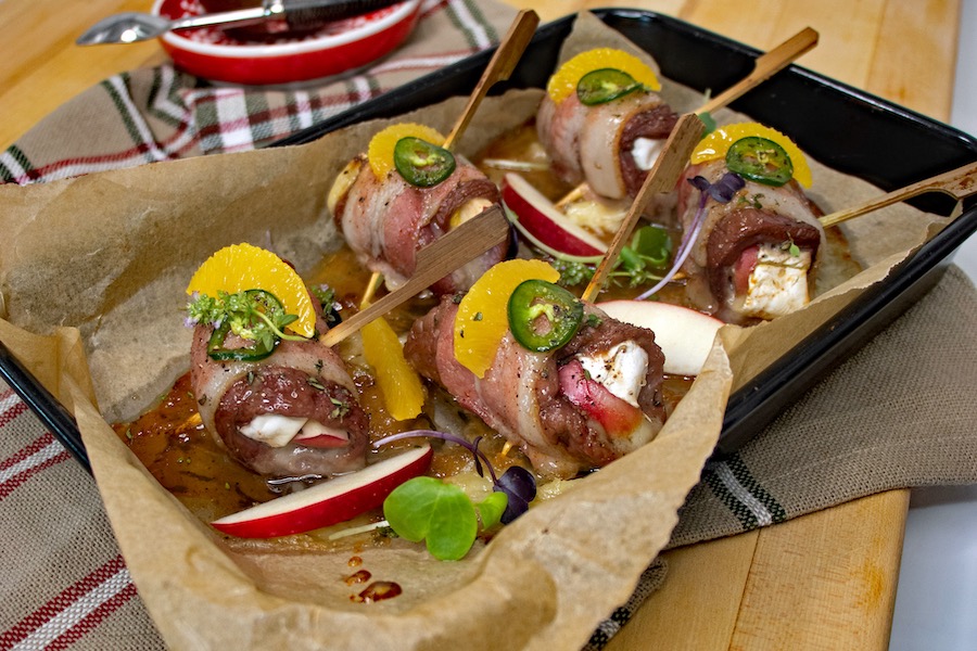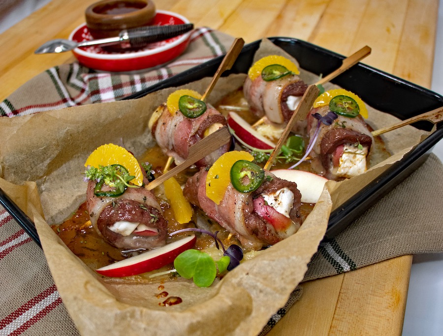Simple yet sophisticated, this wild duck recipe features the rich flavours of creamy brie, crispy bacon, sweet-and-tart apple and a glaze of spiced honey—perfect for duck hunters wanting to savour their bounty in a new and memorable way. The poppers can be served as delicious appetizers or as a main course, together with wild rice and garlic-roasted fall root vegetables. Serves 4