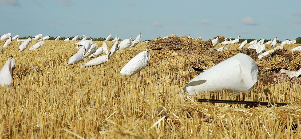 Windsock decoys are essentially bags, typically constructed of lightweight and durable Tyvek material. Some are white or black, while others are dyed to replicate the full colours of the ducks and geese they’re meant to resembe. Generally, they’re the size of a small goose, open on one end to catch the wind and inflate. They have either a metal or plastic stake through the front end that gets pushed into the ground to hold them in place, allowing them to freely bounce and flutter like ducks or geese waddling in a stubble field.