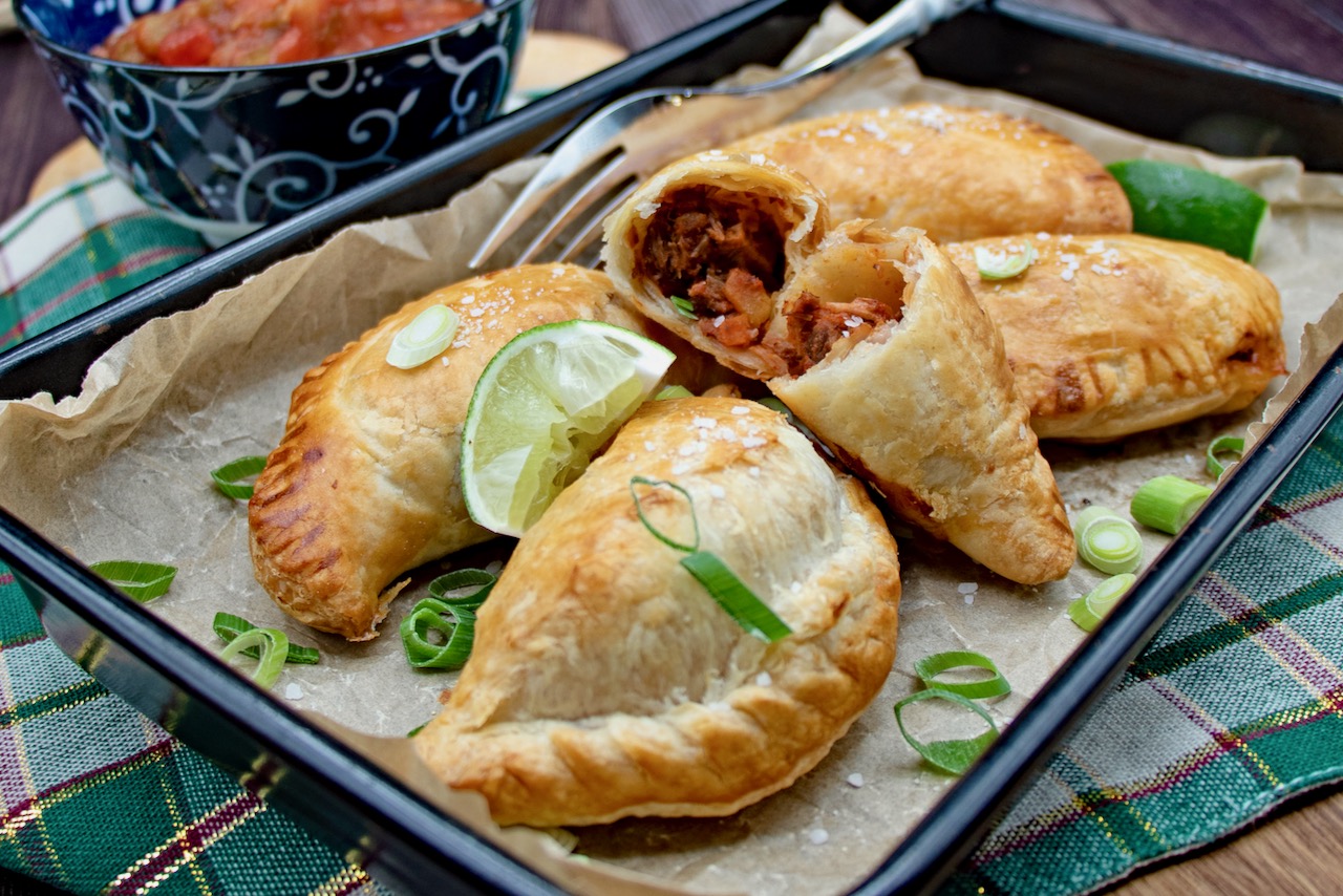 - Place chilled empanadas on a parchment-lined baking sheet, brush with egg wash, and bake in oven for 20 minutes or until golden brown. Serve immediately with your favourite salsa sauce.